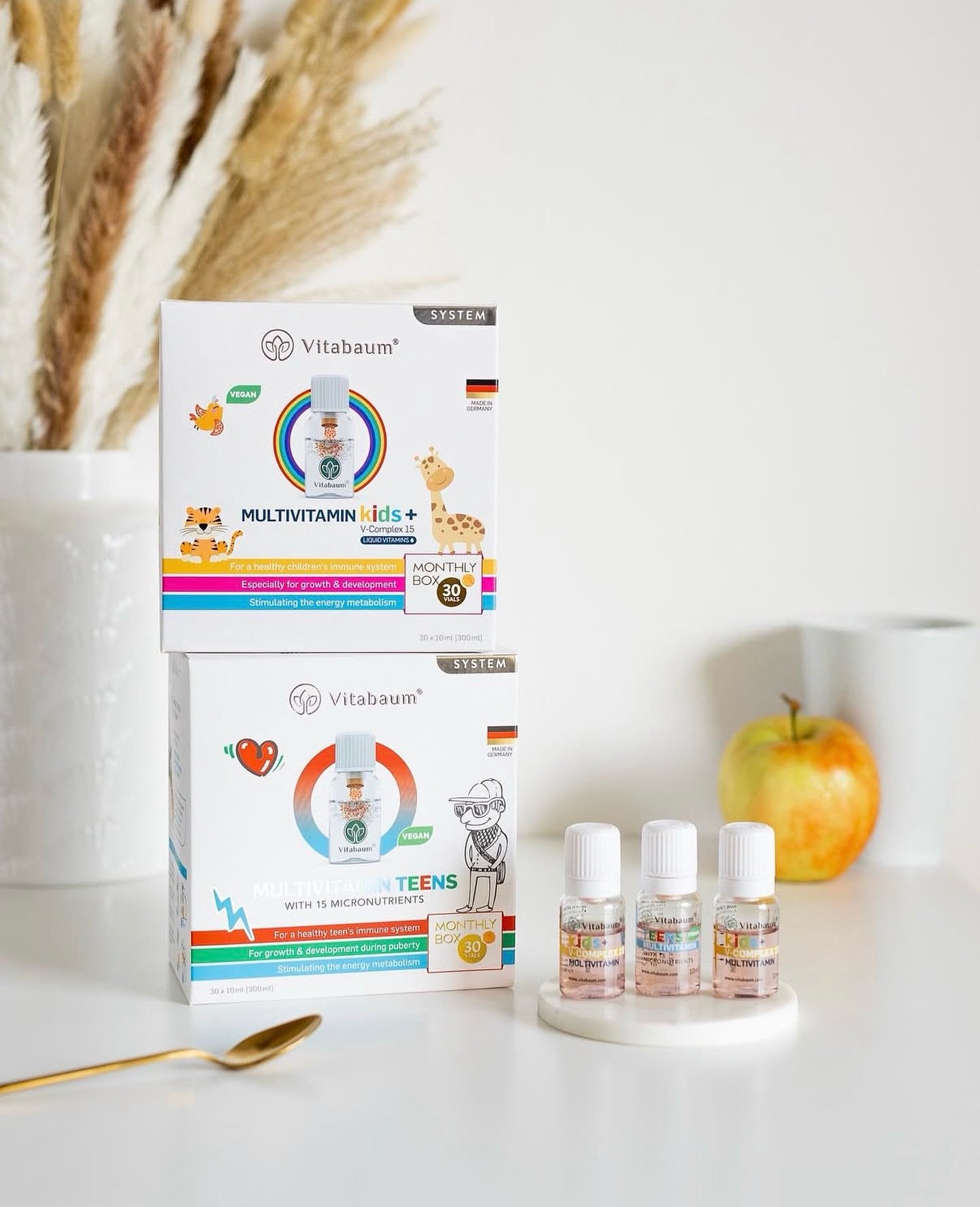 Vitabaum Multivitamin Kids+ ийн гол онцлог бол Герман улсад үйлдвэрлэгдсэн, VEGAN тэмдэглэгээтэй, 15 төрлийн витамин, эрдсийн найрлагатай, 3 наснаас дээш хүүхдэд зориулсан бүтээгдэхүүн юм. Vitabaum Multivitamin Kids+ витамины гол зорилго нь дархлааг дэмжих, өсөлт хөгжлийг дэмжих, энергийн солилцоог идэвхжүүлэх, сургууль, цэцэрлэгийн ачаалал даах чадварыг нэмэгдүүлэхэд оршдог.