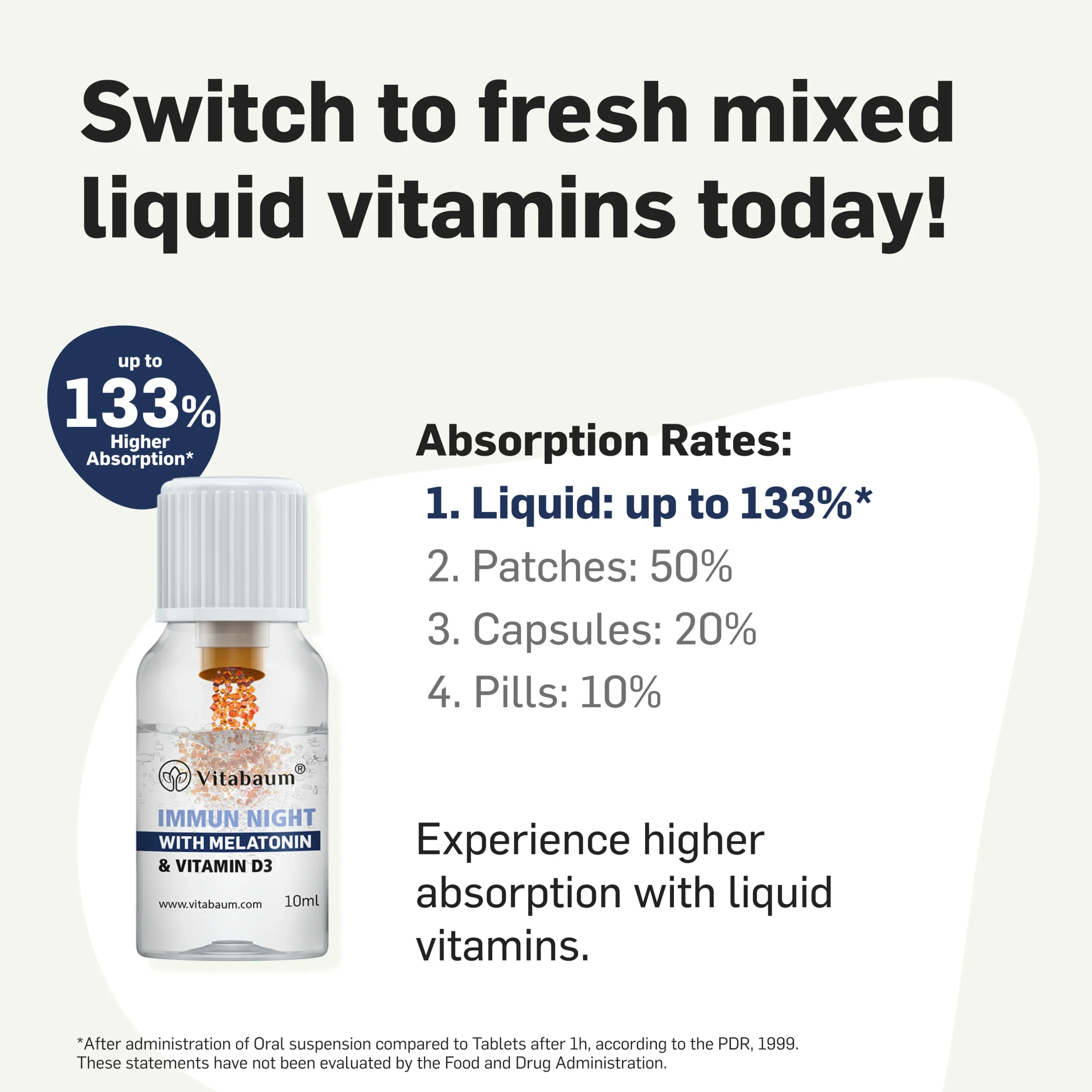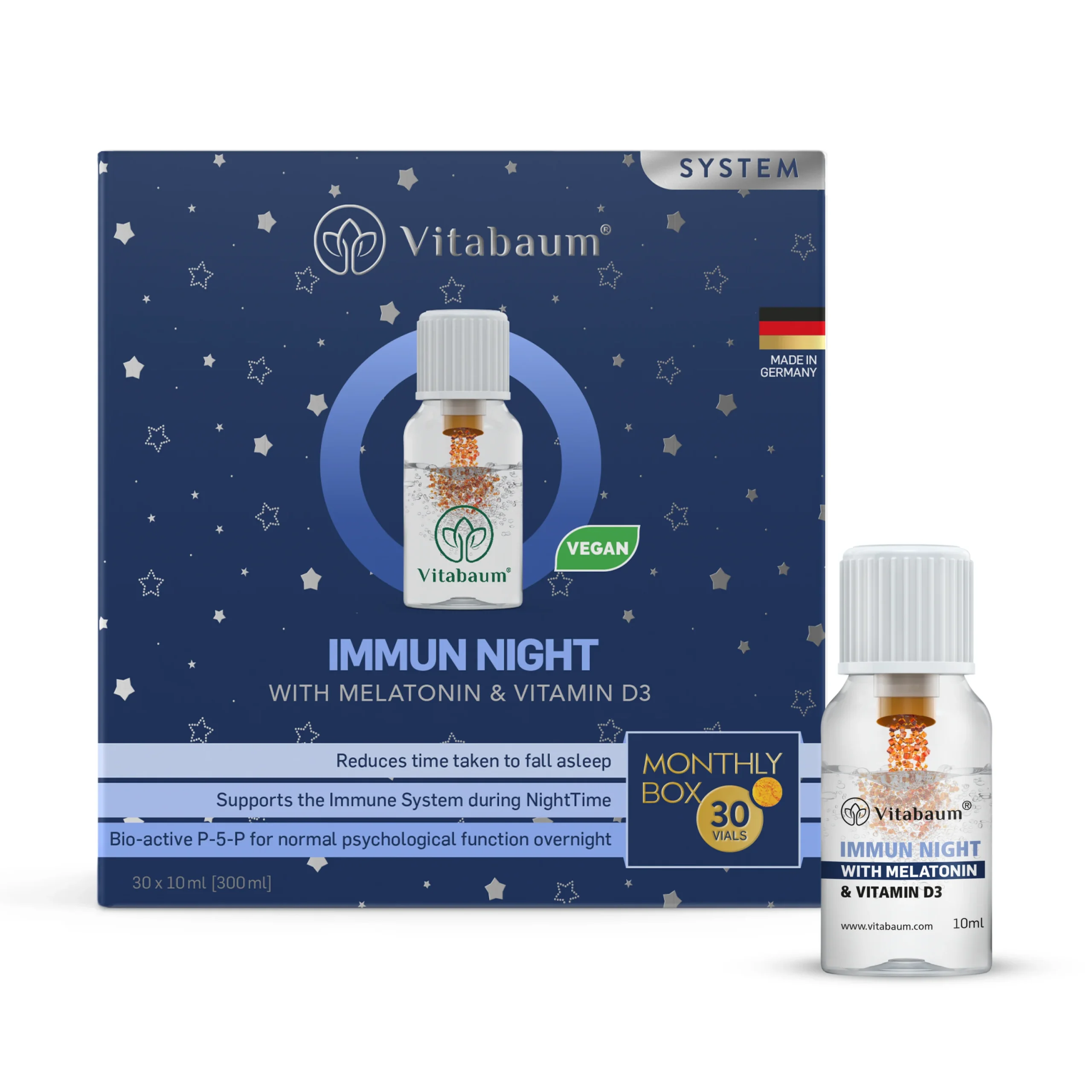 ВИТАБАУМ® ИММУН НАЙТ Vitabaum Immun Night нь мелатонины тайвшруулах нөлөөг чухал амин дэм, эрдэс бодисуудтай хослуулан таны нойрны чанарыг сайжруулахын зэрэгцээ дархлааны системийг тань дэмжинэ.* Манай Twist & Mix System™-ийн тусламжтайгаар та шинэхэн найруулсан, жимсний амттай шингэн Vitabaum Immun Night хэрэглэх болно — зүгээр л мушгиж, хольж, унтахынхаа өмнө хэрэглээрэй.