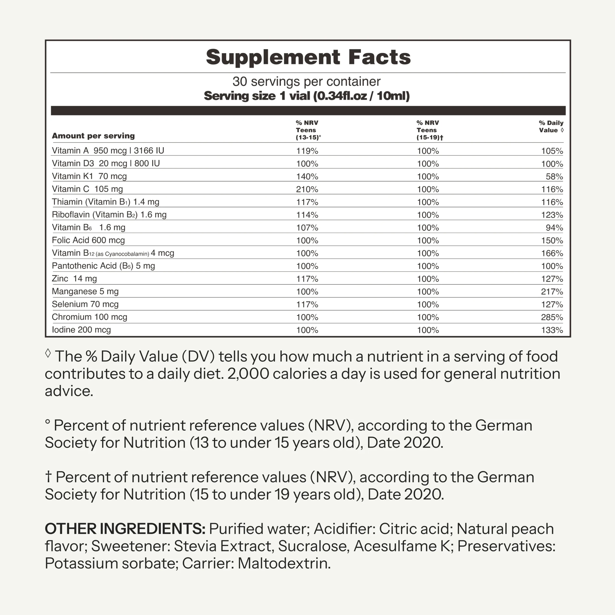 Vitabaum multivitamin teens нь зөвхөн өсвөр насныханд зориулагдсан бүх чухал амин дэм, шим тэжээлээр дүүрэн байдаг.* Энэ амин дэм нь бидний дархлааны системийг дэмжих зорилготой бөгөөд энэ нь өсөн нэмэгдэж буй жилүүдэд маш чухал юм.* Энэ нь өсвөр насны хүүхдийн эрч хүчийг нэмэгдүүлж, оюун санааны тунгалаг байдлыг сайжруулж, сайн сайхан байдалд хувь нэмэр оруулдаг.